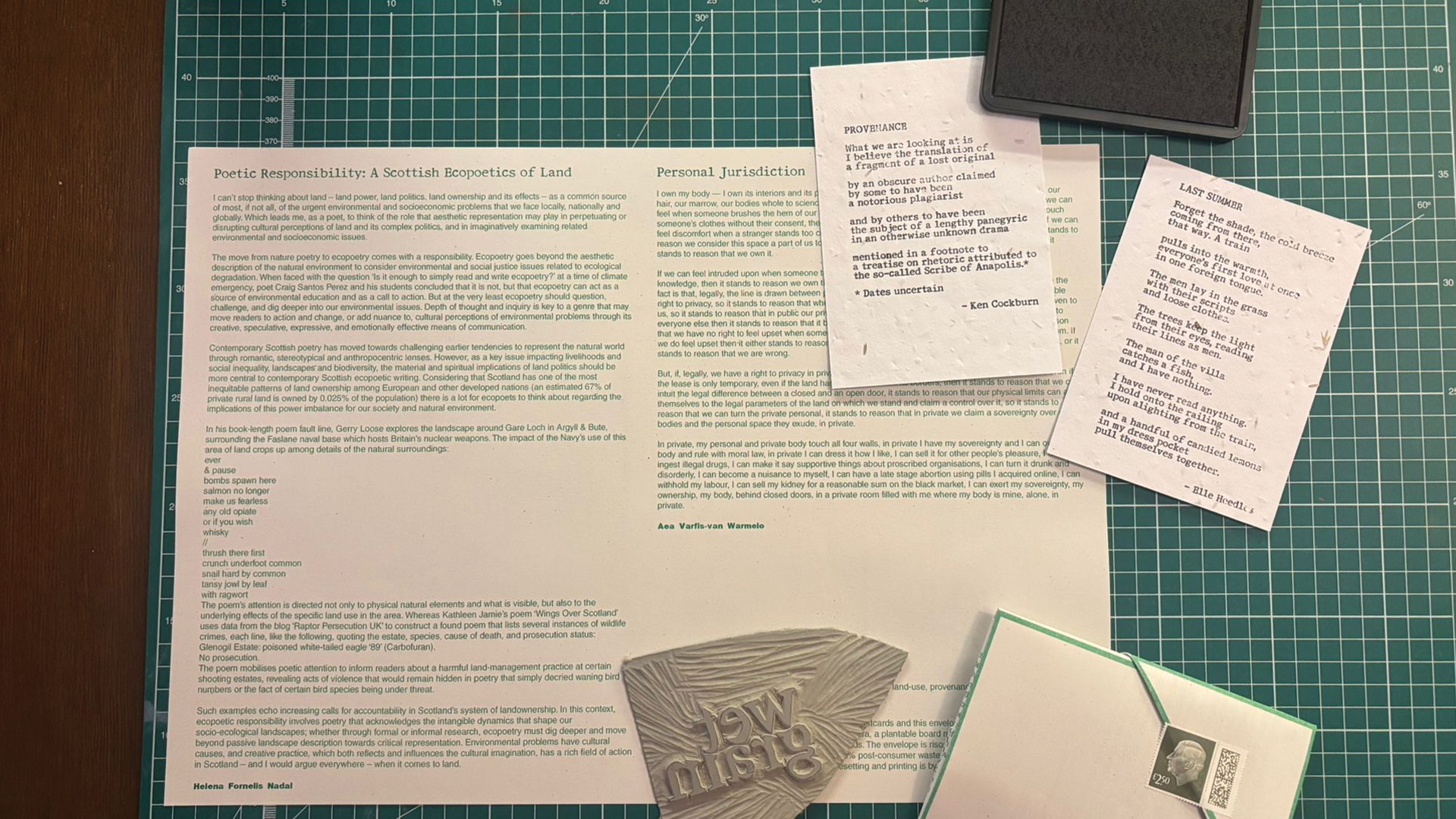 We’re also delighted to share pictures of our first sheaf, designed and riso-printed by Typewronger Books. New prose on personal space by Aea Varfis Van-Warmelo and poetic responsibility by Helena Fornells Nadal. Poems from Issue One by Elle Heedles and Ken Cockburn have made their way onto seeded paper as postcards. The only way to get ahold of these is by subscribing to the magazine.